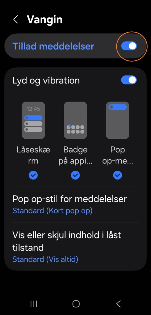 - Undir appoplysninger skalt tú velja Meddelser og síðan virkja Tillad meddelelser
